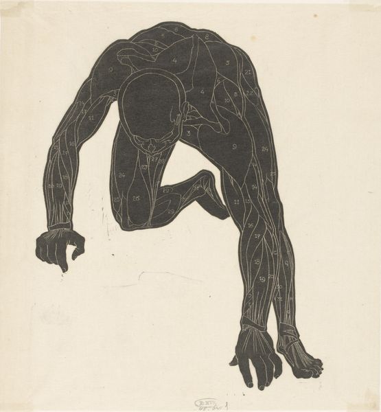 Editor: So, this is Augustus Hamilton Peck’s “Negro Dancing,” created around 1937. It's a print, and the figure kind of gives off an unsettling vibe... all twisted and elongated like that. What do you see in this piece? Curator: Immediately, I'm struck by the weight of cultural memory embedded within the title and the imagery. "Negro Dancing"—that terminology carries so much historical baggage, doesn’t it? The distorted form, caught mid-motion, what could it signify? Joy, or something far more complex like the distorted performance of identity under duress? Consider the period—the late 1930s—the shadows of Jim Crow were long and stark. Editor: I hadn't thought about the title that way. It seems so… clinical against the emotion in the figure. Is that intentional? Curator: Perhaps. It prompts us to think about how names and representations, how we frame an image, directly impacts its reading, its felt presence. Does the lack of facial detail amplify that sense of a suppressed identity, a body moving, yes, but stripped of individual agency? Think about African masks, where anonymity grants access to something other, something greater than the individual. Does that analogy resonate here? Editor: It does, in a way. Like the figure isn't just a person dancing, but maybe embodies the spirit of a whole cultural experience. Curator: Precisely. And then, there's the Expressionist style Peck employs. The elongated limbs, the shadowy background. Expressionism often serves as a language for trauma, for societal unease. Ask yourself: What psychological landscape is Peck painting for us? Editor: Wow, I will. There is so much more to this image than what initially meets the eye. Thanks! Curator: Indeed! And understanding the layers is key to appreciating the depth and complexity of cultural expression.