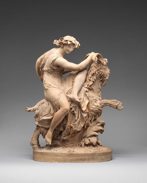 Clodion, or Claude Michel, created "The Intoxication of Wine" in the late 18th or early 19th century. This sculpture, crafted from terracotta, embodies the Rococo style's sensuality. Clodion made a career out of small-scale sculptures for private collectors during a time of social inequalities. In this context, the sculpture depicts a bacchanal scene, referencing classical mythology and themes of revelry and ecstasy. We see a satyr, a mythological creature associated with Dionysus, the god of wine, embracing a bacchante. The bacchante tips a cup of wine, symbolizing unrestrained pleasure. The sculpture's emphasis on sensuality and abandon resonated with the aristocracy, yet it also reflects the social tensions of the time. While celebrating pleasure, it also hints at the moral ambiguities and excesses of the era. Clodion’s sculpture captures a moment of joyous release, offering viewers a glimpse into a world where boundaries blur.