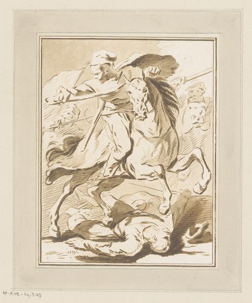 Anthonie van den Bos created this drawing, 'Rider with Dog', using pen in brown ink. The drawing presents a dynamic scene, dominated by a horse and rider emerging from a cloud of loosely defined forms. The composition is structured by diagonal lines, creating a sense of movement and instability. The monochromatic palette, executed in brown ink, reduces the forms to their essential outlines and tonal values, and evokes a certain drama. This piece explores themes of power and dominion, as evidenced by the commanding figure on horseback and the dog below. Yet, it also hints at the precariousness of such authority, given the turbulent backdrop and the sketch-like quality of the forms. Van den Bos challenges traditional notions of heroism through the use of ambiguous space and gestural lines, and disrupts fixed meanings, reflecting broader cultural shifts in the perception of leadership. The artist's emphasis on line and form destabilizes established meanings and invites us to question the foundations upon which traditional narratives of power are built. The work serves as a site of constant reinterpretation.