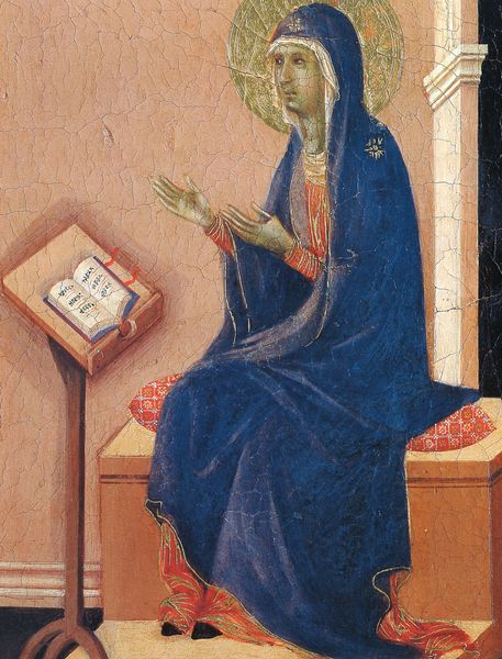 Curator: Looking up at Domenico Ghirlandaio's "St. Mark the Evangelist," painted around 1490 in the Santa Maria Novella, what strikes you? Editor: He seems so isolated. Perched up there, surrounded by ornate geometry. There is this overwhelming feeling of separation between the saint and the world below. Curator: Interesting. Think about St. Mark himself – he's usually paired with the winged lion. See how it rests passively at his feet, its face almost melancholic? This fresco presents not just a saint, but attributes linked to Mark, suggesting the weight of divine inspiration, the solitude of sacred texts. Editor: And he's actively writing or perhaps correcting a manuscript. Is Ghirlandaio depicting the Evangelist at a crucial moment in the shaping of religious doctrine? Considering the work's prominent display within a historically significant Florentine church, "St. Mark" doesn't exist in a vacuum, does it? It had to function in a particular historical environment. Curator: Absolutely. Florentine society valued learning and literacy, particularly with the humanist movement gaining momentum, but within the walls of a Dominican church! Look, here he’s creating a holy narrative. Notice how his clothes are rendered; they provide context of his importance to society. Gold, commonly linked to God, glows around St. Mark's halo, and that divine presence is subtly reinforced again and again by these subtle elements in our shared visual vocabulary. Editor: What about the viewer down on the floor? What does he receive from all that’s included up there in that triangular space? He can easily decipher that Mark is a powerful being—a learned intellectual with a deep connection with God, but not truly among them. A representation of holiness intended for public consumption, really. Curator: Exactly. Think about the role these images play. In Renaissance Florence, it was integral to religious and cultural identity, blending spiritual doctrine with visual literacy and asserting civic pride with beauty. Editor: In that triangular space it becomes the embodiment of cultural power. This art then becomes this political statement. Curator: I think we both discovered fresh meaning in this Renaissance gem. Editor: Indeed. Now when can we get up to more fun with art like this?