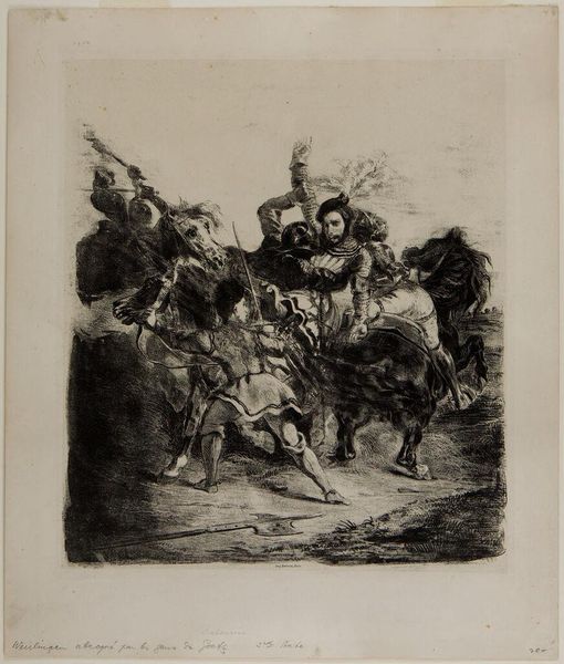 Bartolomeo Pinelli created the etching "Aulus Cornelius Cossus doodt Lars Tolumnius" in the early 19th century, amid a surge of nationalist sentiment in Europe. Pinelli, an Italian artist, often turned to the stories of ancient Rome, recasting them with contemporary political undertones. Here, we witness Aulus Cornelius Cossus, a Roman soldier, slaying Lars Tolumnius, king of the Etruscan city of Veii. This scene isn't merely a historical depiction, but a reflection on power, valor, and the identity of a nation. The artist uses strong lines to highlight the tension and drama of the moment: the fallen king, the triumphant soldier. But consider who gets to tell this story. Who is remembered as the hero? What does it mean to glorify war and conquest? The act of immortalizing this ancient victory speaks to the desire for a unifying narrative, reminding us that art is never neutral. It's a reminder that even historical scenes are shaped by the present.