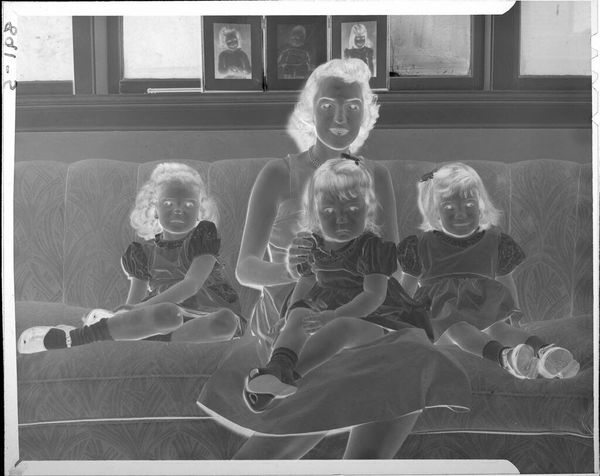 Editor: This photograph, "Untitled (three sisters seated together at home)" by Lucian and Mary Brown, shows the three girls indoors, almost like a casual snapshot. The negative creates a strange, haunting effect. What strikes you about it? Curator: The inversion immediately frames this as more than just a family memento. The presentation within a museum setting transforms it into a commentary on representation itself. How does altering the familiar image of childhood change our perception? Editor: That's a great point. It makes me question the power dynamics inherent in capturing such a personal moment. Curator: Exactly. It also highlights how institutional display can shape our understanding of seemingly private images and their cultural significance. Thanks, I learned something new! Editor: Me too, this was very informative.