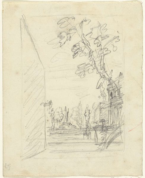 Curator: I find this pencil drawing rather charming. Created sometime between 1715 and 1798 by Dionys van Nijmegen, it’s titled “View in a Garden with a Pond and an Open Door in the Foreground." Editor: Immediately, I'm struck by how it invites the gaze, beckoning the viewer into the scene. There’s almost a theatrical quality, the doorway serving as a proscenium arch. Curator: Yes, and that open doorway – a classic symbol of opportunity or a passage to another realm, isn't it? Van Nijmegen clearly wants us to contemplate what lies beyond, quite literally reframing our perception of space. Editor: I read it more critically, to be frank. Consider the period. Gardens were highly manicured status symbols of the aristocracy. Does the ‘invitation’ reinforce exclusion by showcasing inaccessible private space? Curator: That's an interesting point, it adds complexity, particularly when we consider how carefully the perspective is rendered. The artist even added notes specifying precise distances. He seemed very interested in perspective's symbolic and actual power. Editor: Power that stems from its representational accuracy and that accurately represented class structure in that historical moment. Those details could be measurements for a structure, potentially reinforcing who gets to survey and who is surveyed. Curator: Well, yes, that's fair. Still, you cannot deny the drawing’s appeal—a blend of precise structure with the softness of natural elements, creating a contemplative, visually balanced harmony. Editor: Agreed, it's more than just an image of control. But for me, its value resides precisely in understanding its dual function as a tool for creating both visual harmony and power imbalances. Curator: An interesting contrast—to reflect both its aesthetic draw and historical position, it does challenge one's perspectives. Thank you for giving me some food for thought! Editor: Absolutely! Context shifts our view, illuminating its layers of complexity and its resonating social meaning across eras.