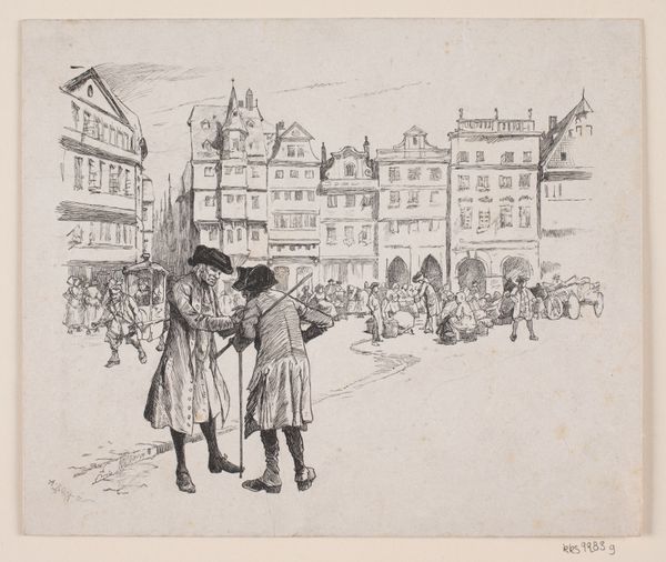 Editor: Enrico Nardi's "View of Palazzo Montecitorio with the obelisk of Psammetichus II," created in 1892 with watercolor and drawing on paper. I’m really drawn to the stark contrast between the meticulously detailed architecture and the soft, almost dreamlike quality of the watercolor. How do you read this piece? Curator: Formally, I see a dynamic interplay between structure and fluidity. Note the architectural precision in rendering the Palazzo – the sharp lines, the defined columns. Contrast this with the more gestural depiction of the figures and foliage, achieved through the watercolor medium. The linear perspective converges towards the Palazzo, creating a sense of depth. Does that hold your interest? Editor: It does. It's almost as if the building itself is the main character, firmly planted in reality. But the people seem… transient. What is the effect? Curator: Precisely. The solid geometric forms of the architecture establish a rigid framework. In contrast, the fluid watercolor creates a sense of movement and impermanence. Consider how Nardi juxtaposes these two elements; The obelisk, a symbol of permanence, further emphasizes the architecture’s immovability, in conversation with the temporality of human existence. Does it invite you to linger longer? Editor: Yes, I can really notice the relationship between architectural forms and watercolor. The interplay between structure and fluidity offers a richer understanding. Thank you! Curator: Indeed. Recognizing the significance of compositional elements can make a difference in decoding any painting.
