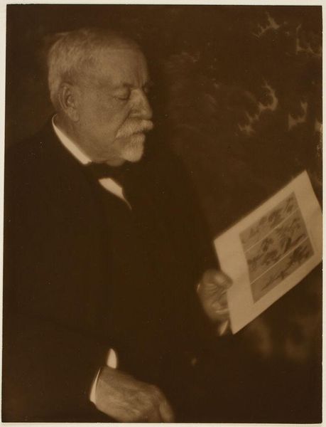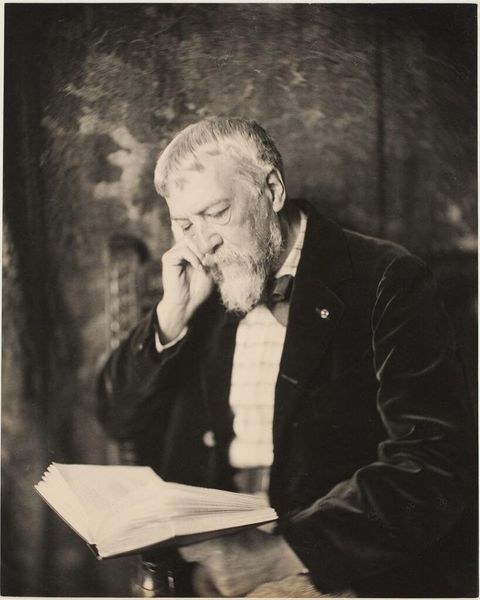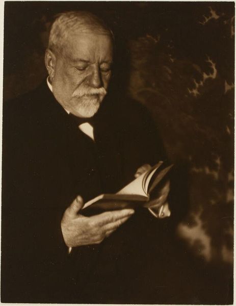 Editor: This is a photograph of Charles Sprague Sargent reading a book, by Sarah Choate Sears. It's a small, intimate portrait. What stands out to you about the materiality of this piece? Curator: The photographic process itself is key. Sears, as a privileged woman, had access to both the technology and the leisure to master it. Consider the darkroom work, the manipulations of light and shadow. It's not just a representation, but a constructed image, born from specific social conditions. Editor: So, the making of it is as important as the subject? Curator: Absolutely. The very act of creating art was a statement. How does Sears's social standing influence how we perceive her work and her access to making it? That question challenges traditional notions of artistic genius.
