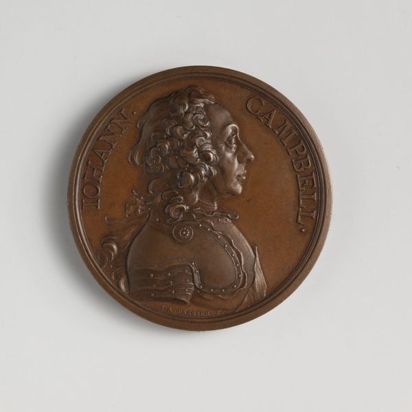 Curator: Here we have Jean Dassier’s bronze medal, "George II, from the English Monarchs series," dating back to 1731 or 1732. It resides here at the Metropolitan Museum of Art. Editor: The first thing that strikes me is how weighty it looks, even in a digital image! It possesses a certain seriousness, but it is softened by the curls. I think those wild locks say everything! It's all so... symbolic. Curator: Exactly! The medal operates in this fascinating space between portraiture and symbolism, right? Neoclassical art frequently looks toward this idealized representation of power, especially in portraits of royalty. That classical wreath intertwined in his wig is almost comically at odds with that decidedly baroque mountain of curls! Editor: Absolutely! I’d say it’s quite the intentional choice—marrying old symbols with new fashion. That juxtaposition underscores a desire to appear timeless, yes? Even the lettering framing his profile speaks of legacy and lineage; that desire to etch his mark—literally, into history. Medals have such powerful permanence as objects! Curator: Indeed! These kinds of engravings acted as historical records but also functioned almost like press releases in their time. Think of them as the 18th-century version of curating your public persona on social media. They served not only to commemorate but to persuade. Editor: So, this isn’t just about historical record-keeping; it's a meticulously constructed narrative—every detail from the laurel wreath to the determined set of his jaw! It's so curious to observe the ways powerful leaders throughout the ages, regardless of the era or location, have attempted to shape perception through artistic devices and objects. The layers upon layers of meaning embedded within its materiality! Fascinating. Curator: Definitely. This medal allows us to peer into that enduring quest for lasting legacy, crafted quite literally in metal!