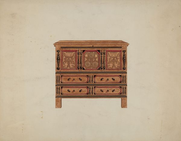 Editor: We’re looking at “Highboy,” a pencil drawing by Frederick Jackson, created between 1935 and 1942. The precise linework, the symmetrical design; it all feels very controlled and meticulous. How would you interpret its place in art history? Curator: This piece prompts a question: is this art, or documentation? During this period, we saw the rise of the Index of American Design, part of the WPA, the Works Progress Administration. Artists were employed to document American material culture. Did Jackson consider himself an artist, or a recorder? Editor: That’s a good point. I hadn’t thought about the social context influencing its creation. Do you see any other ways the WPA might have shaped this drawing? Curator: Absolutely. Consider the almost clinical precision. These artists were essentially archivists. Their task was to preserve a record of American craftsmanship, likely disappearing because of mass production. It also made arts accessible to broader audiences, right? By representing them to wider communities that potentially had less access to the originals? Editor: So it's not just about documenting but also democratizing access to design. The drawing gains another layer of meaning now. Thanks for putting this into context. Curator: My pleasure. It's a great example of how understanding the social and institutional forces behind artmaking can enrich our understanding of even seemingly straightforward images. Editor: I learned that an artwork like this one can serve many different functions simultaneously, both for its original creator and for a wide audience.