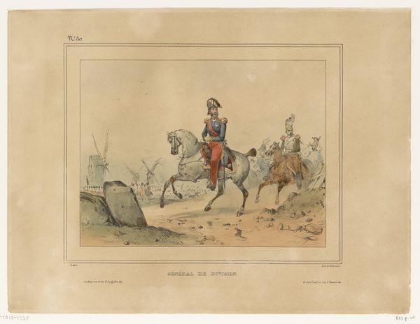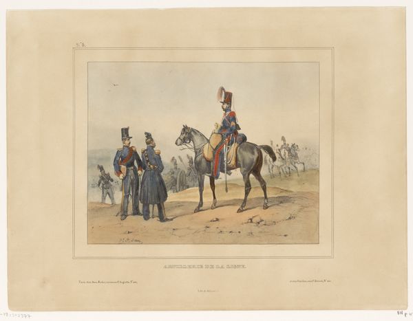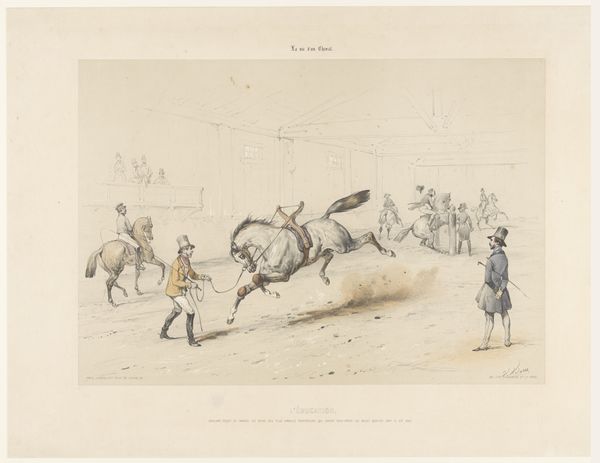 Victor Adam created this artwork, "Verval en verkoop van het paard Brillant," using lithography. The scene presents itself with a muted palette, dominated by soft greys and browns, which evokes a sense of quiet observation. The composition guides your eye from the detailed figures in the foreground to the less defined crowd in the background, creating depth. The central horse, "Brillant," is posed dynamically, with attention drawn to its musculature and movement, alluding to vitality and value. Adam’s strategic use of line and form highlights the social structure of the event. The crisp lines of the figures contrast with the hazy background, subtly emphasizing the commercial transaction at the center. This work functions on a semiotic level, using the horse as a signifier of wealth and status, with the sale representing a transaction of power. The setting and the arrangement of the figures suggest a commentary on social relations and economic exchange of the time. The deliberate contrast between detail and haziness invites a continuous re-evaluation of what is emphasized and what is subtly critiqued within the artwork.