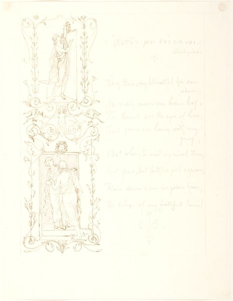 Editor: We’re looking at a pencil and ink drawing on paper by Lorenz Frølich, created in 1860. The title is quite a mouthful: "Om du vælter dig paa dit ensomme Leje, om du kaster dig fra højre til venstre... intet vil det baade dig..." or in English, “If you toss about on your lonely couch, if you throw yourself from right to left... nothing will avail you…". I'm struck by how light and airy it is, almost like a dream. How do you approach a piece like this? Curator: Initially, the composition draws the eye. Note the arrangement of figures – how they are distributed across the plane, seemingly floating, organized by linear, organic elements. The interplay between the figures in repose and the architectural scene below establishes a clear division within the pictorial space, though rendered in the same delicate tonalities of pencil and ink. Consider also the texture achieved through line weight and density. What does the artist achieve with this variation? Editor: Well, the varied line weight does give depth, particularly to the figures in the upper section, suggesting a weightlessness in contrast to the defined structure and the architecture beneath. Curator: Precisely. The stylistic choices align with Romanticism. Examine how the figures' gestures and postures interact. Each conveys a sense of introspection or longing. Even the decorative, almost Rococo, elements have a structuring effect. Are they merely ornamental, or do they further inflect the composition? Editor: I see your point. Even those flourishes help guide the eye and reinforce the separation of spaces, almost like framing each figure's emotional state. Curator: Precisely. And this close analysis helps uncover how Frølich achieves the delicate balance between form and content to generate such depth in such a sparse piece. Editor: I see it now, focusing on these core elements clarifies its effect. Curator: Indeed, it’s the structure that communicates so profoundly.