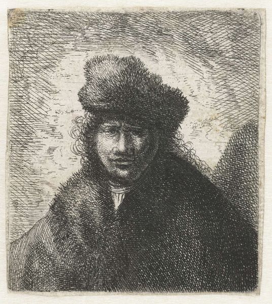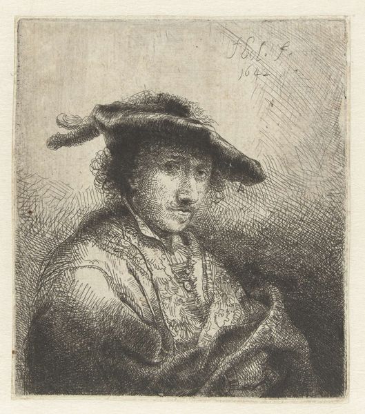 Editor: Here we have Ferdinand Bol's "Man with Two Plumes in His Cap," an etching. It's so small and detailed! What can you tell me about it? Curator: Bol's etching reveals much about 17th-century printmaking processes and their socio-economic context. Notice the intricate lines achieved through the etching technique. How do you think access to these prints influenced art consumption? Editor: I guess more people could own art this way! Curator: Precisely. The materiality of printmaking democratized art, shifting its value from unique object to reproducible commodity. It makes me wonder about the role of the art market and the consumption of images then versus now. Editor: It's amazing to think about how the same image could spread so widely. Thanks for pointing out the connection between process and access!
