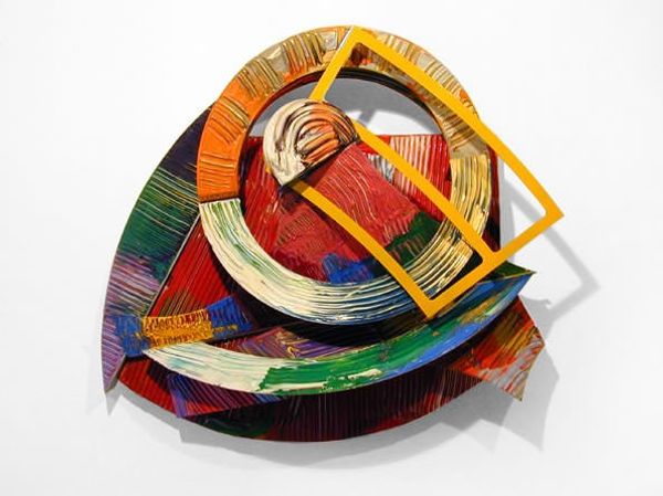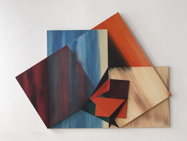 Editor: Here we have Charles Hinman’s “Pizzicato” from 1964, made with collage and paper. I’m struck by its strange, almost musical shape and the bold colour blocking. What's your take on this intriguing piece? Curator: I see it as a fascinating artifact of its time. Hinman worked during an era when art was deeply intertwined with questions of space, form, and the very definition of painting and sculpture. The Hard-edge painting movement pushed the boundaries of traditional art forms, prompting artists like Hinman to explore dimensionality in innovative ways. It’s less about traditional artistic skill and more about challenging how we perceive art’s place in the world, especially within galleries and museums. How does this challenge, to push art outside traditional means of display, impact your view of the piece? Editor: That context really shifts my understanding. It makes me consider the "Pizzicato" less as a standalone object and more as a statement against artistic conventions. Was the public receptive to such a radical shift? Curator: Reception was, as you can imagine, varied. Some celebrated the innovative approach, seeing it as a necessary evolution. Others criticized the apparent simplicity, questioning whether it even qualified as "art." This tension reflects broader debates about the role of art in society, doesn't it? Editor: It certainly does. So much is being debated, even today. It’s like, "What does this even MEAN?", especially with a movement name like “Hard-edge painting”. Curator: It might seem austere at first glance, but the choice of such striking colors speaks to the visual experimentation characteristic of the 60’s. You start to see the visual dynamic between the colors, and consider the history it exists within. Editor: Exactly! Thinking about this piece within a larger history and understanding its cultural role certainly deepens the experience for me. Curator: And for me too. Considering your point of view provides a reminder about art, which is that meaning is always co-created.