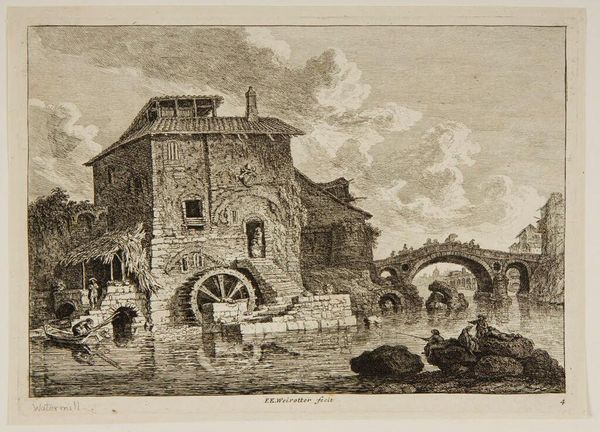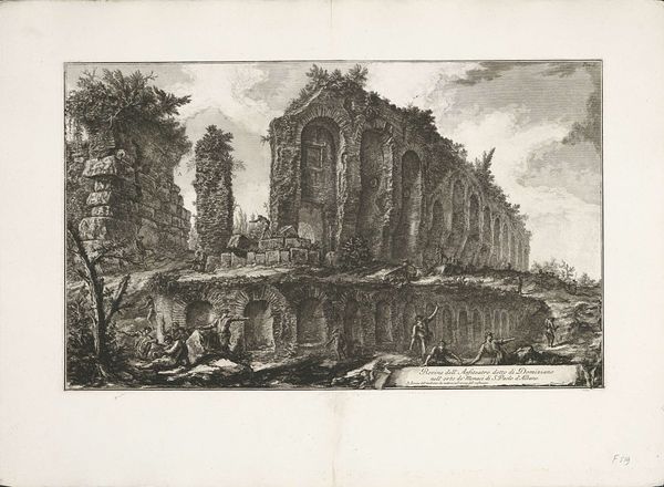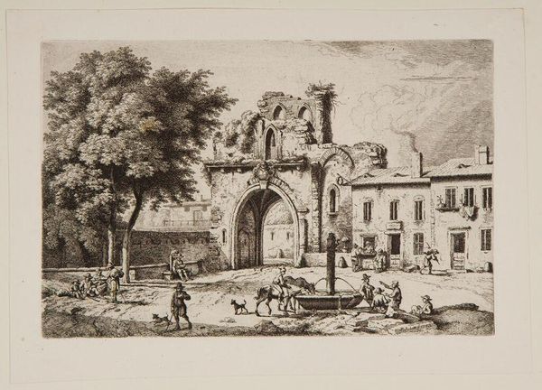 Editor: We’re looking at “In the Surroundings of Tivoli,” a print by Franz Edmund Weirotter. The crumbling architecture gives it a solemn feel. What echoes of the past do you find resonant here? Curator: It certainly evokes a sense of time's passage. Notice how Weirotter depicts the ruins: those arches, the textures. They're not just decaying structures, but symbols. What do ruins generally represent in art and cultural memory? Editor: Loss, maybe? The inevitable decline of civilizations? Curator: Precisely. They're memento mori, visual reminders of mortality, but also testaments to past grandeur. The figures at the base seem almost dwarfed, emphasizing the scale of history. What kind of emotional impact do you think that had on viewers of the time? Editor: I see, so it's not just a pretty picture, but a reminder. Thanks! Curator: Indeed, art often speaks volumes beyond its surface. It’s been enlightening to explore those meanings together.