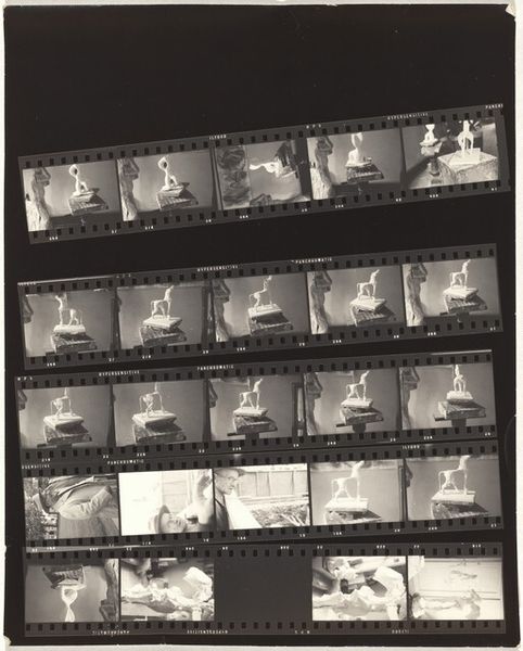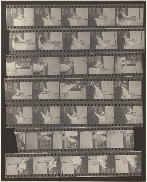 Editor: Here we have Robert Frank's "Mary and Andrea in hospital I," a gelatin silver print from 1954. It's essentially a contact sheet, filled with images of two women in a hospital setting. There's something haunting about it, almost voyeuristic. What symbolic readings strike you? Curator: The contact sheet itself becomes a symbol. Each frame represents a moment, a fleeting experience of vulnerability. The hospital bed, a site of both healing and suffering, resonates deeply with cultural anxieties around the body, illness, and mortality. Look how the subjects shift, mirroring stages of convalescence or perhaps deeper emotional states. Do you notice a consistent visual thread? Editor: There's a repetitive element – the figures repeat but never exactly the same, reflecting shifting moods. Curator: Exactly. Repetition with a difference, like a mantra. In that respect, Frank may be echoing a visual structure for mourning, of cycles of suffering. What is the most striking photograph? Editor: Perhaps the image in the top right where one figure sits upright and turns her head? Curator: It arrests you. In this context of illness and introspection, her turned gaze could mean a lot of things. Maybe confronting mortality or finding a flicker of hope in facing it. It suggests agency – something not always afforded to those who are vulnerable. A powerful symbolic act! Editor: This makes me see it completely differently. The seeming randomness transforms into a deliberate study of emotional and psychological endurance. Curator: Precisely. It's in the layering of these visual symbols – the contact sheet, the hospital, the figures’ gestures – that Frank's photograph transcends a simple document and becomes a powerful meditation. Editor: I'll remember to look closely at the repetition within the whole, not just in individual elements. Curator: A good start to looking with intention.