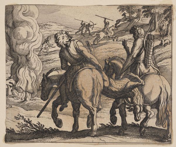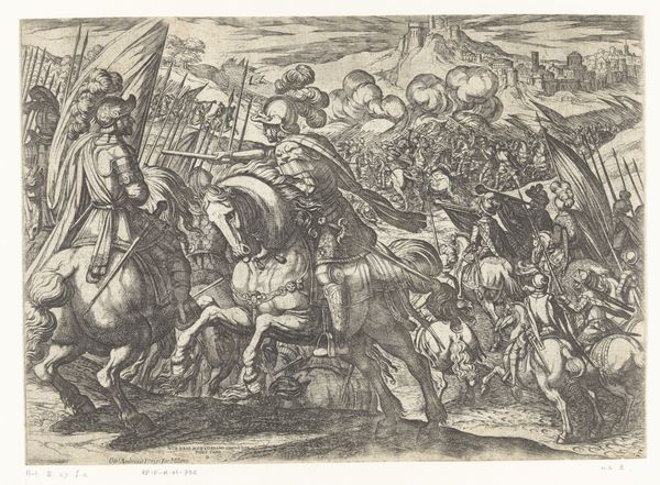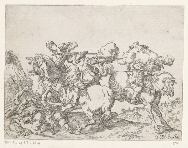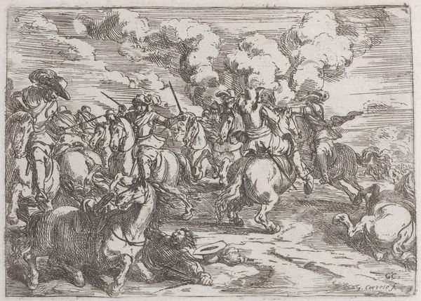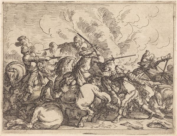 Editor: Here we have Johann Wilhelm Baur's "Capricci di varie battaglie" from 1635, rendered as a detailed engraving. The sheer number of figures locked in combat creates a really chaotic, overwhelming feel. What can you tell me about this work? Curator: Considering a materialist approach, I see Baur documenting not just battle, but the socio-economic infrastructure underpinning warfare. The printmaking process itself—the labor of the engraver, the availability of materials like the metal plate and inks, the distribution networks for the finished prints—highlights the industrialization of conflict, if you will. Who consumes this image? And how might that consumption fuel the continued production of similar imagery, perhaps even legitimizing the violence it depicts? Editor: That's a fascinating perspective. I was so caught up in trying to decipher the scene, I hadn't really thought about what the creation of the artwork itself meant. Does the Baroque style play into that material analysis? Curator: Absolutely. The Baroque, with its emphasis on dramatic movement and emotional intensity, became a sort of visual commodity. In prints like this, made accessible through relatively cheap production methods, Baroque style could broadcast messages about power, heroism, and, yes, even the spectacle of violence, to a broad audience. But look at the details, at how the artist meticulously rendered each figure and weapon. Think about the artisan labor involved. What does that investment of time and skill suggest about the value placed on depicting conflict in this way? Editor: So, it's not just about the battle itself, but about how representing these battles became part of a broader system. I'm seeing the image in a totally different light now. Thank you. Curator: Exactly! It forces us to question whose interests are being served by the art, and how. Always dig beneath the surface.