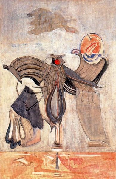 Editor: Here we have an Untitled oil painting by Mark Rothko, created in 1942. It's... well, it's definitely striking. There's a primal feel to it. The distorted figures almost feel like they're emerging from a dream, or maybe a nightmare. What do you see in this piece? Curator: The symbolism here is rich and dense, pulling from cultural memory. Notice the bird-like figure, seemingly nuzzling or confronting the human face. Throughout history, birds often symbolize transcendence, the soul's journey, but here, it's… unsettling. What feeling does it evoke in you? Editor: A little unnerved, definitely. It's like a distorted fairytale. Is that the influence of Expressionism do you think? Curator: Partially, yes. The distorted forms reflect an internal, emotional state. But there’s also something more ancient at play, a kind of primordial struggle enacted on the canvas. Rothko is exploring those depths of shared symbols here. Consider how those lines almost create a barred effect too.. almost like the people or objects are stuck within themselves, what kind of emotion do you think is trying to come across from that, particularly looking at the mans brow, and face shape. Editor: Now I see that... The man almost looks sad and angry at the same time! And the bird looks trapped in a moment! That helps contextualize the piece with the period a lot more. Thank you. Curator: Indeed. This painting resonates across time, connecting us to deep-seated anxieties and long forgotten desires.