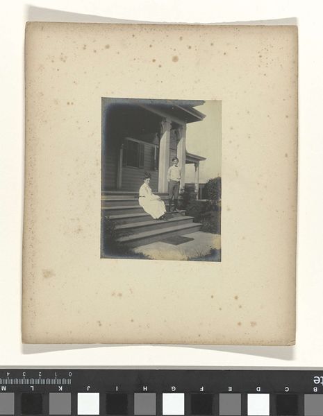 Editor: This is an untitled photograph by Martin Schweig depicting a rephotographed portrait of a woman sitting in a rocking chair on a porch. It’s quite striking how the artist has framed the image within a larger image. What do you see in this piece? Curator: It's interesting how Schweig uses the act of re-photography to comment on the layers of representation. The original portrait, likely a commissioned piece meant to project a certain social standing, is now filtered through Schweig's lens. What does it mean to revisit and reframe a historical image in a contemporary context? Editor: It feels like he's questioning the authority and the perceived truth of the original portrait. By placing it within a new setting, he’s giving it a new narrative. Curator: Precisely. He’s manipulating the image's public role and prompting us to consider the socio-political forces at play in both the original creation and its later interpretation. Both artist and subject become a cultural artifact. Editor: That makes me see the image in a completely different way. Thanks!