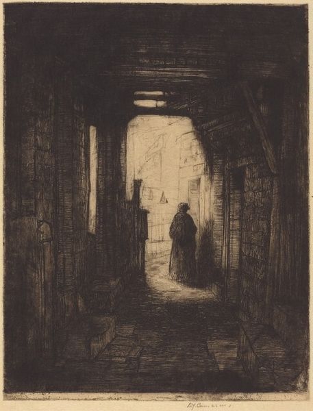 Curator: This haunting image, rendered in etching, is entitled "Sur Le Seuil," or "On the Threshold," created in 1902 by Théophile Alexandre Steinlen. Editor: It evokes such a feeling of apprehensive expectation, doesn't it? The heavy darkness, contrasted by the brightness from the open doorway. Curator: Indeed. Steinlen was deeply engaged with the social realities of his time. The doorway as a symbol suggests a pivotal moment or impending change. Note how this print underscores the plight of marginalized figures in Belle Époque Paris. Editor: That door really seizes the attention. Is it an invitation, a release, or simply a divide? The woman's dark clothing, a visual echo of the background, contributes to this tension. Curator: Precisely. In Symbolist art of this era, such dramatic light often serves to underscore states of profound psychological unease and transformation, and Steinlen effectively employed symbolism throughout his oeuvre to draw attention to injustice. Editor: Do you think her posture communicates something more? Almost a resistance or reticence? I am sensing the emotional weight the open door creates. It could represent choice or necessity. Curator: Given his political leanings, and his ties to socialist and anarchist circles in Montmartre, it's plausible Steinlen employed the open door to signify the urgent need for societal change, but through the solitary figure, suggests individuals alone are vulnerable. The lack of any companion in the space leaves an isolating impact. Editor: The composition as a whole is deeply thought-provoking, with the door acting like a spotlight, almost stage-like, forcing you to consider her narrative. You have such strong symbolism, all rooted in a single point. Curator: Ultimately, Steinlen urges us to confront uncomfortable realities. The strength of his art lies in its persistent social critique, delivered through striking compositions such as this one. Editor: An artist committed to conveying both the burdens and the prospects facing turn-of-the-century society. Curator: Precisely. An excellent summary. Thank you.