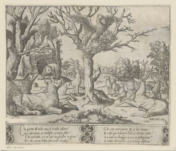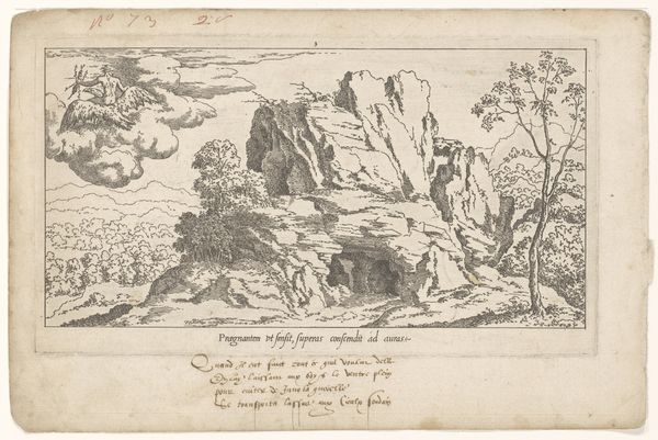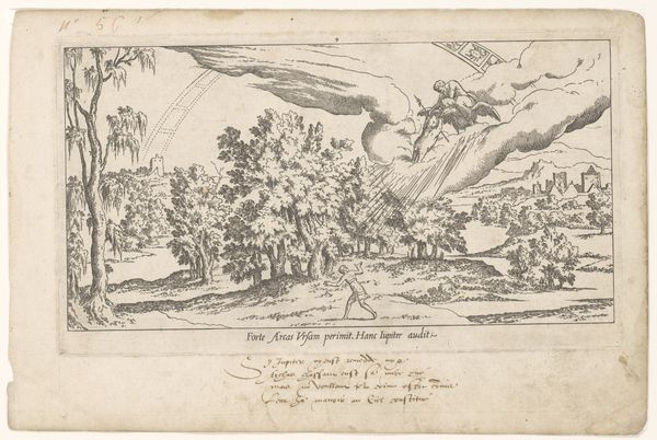 Editor: Here we have "Gevecht tussen Callisto en Juno," or "Fight Between Callisto and Juno," an etching by Léon Davent from around 1547 to 1550. There’s a lot going on in the landscape, but the figures in the foreground are definitely the focal point. I'm particularly struck by the turbulent cloud formations looming above them. What can you tell us about this work? Curator: The drama indeed lies within those cloud formations; they mirror the emotional intensity of the figures grappling below. Notice how the artist has depicted Juno, filled with wrathful vengeance. These aren’t just figures in a landscape, but embodiments of larger symbolic forces, the consequences of transgression, of divine power and feminine rage. Have you considered the role the surrounding nature plays in this scene? Editor: I see it as this ominous, almost theatrical backdrop to the drama unfolding between them. Is the natural setting significant to the narrative? Curator: Absolutely. Consider the history of landscape art at this time. Landscape moved beyond simple setting to become a mirror of inner emotional states and moral allegories. The dense, almost chaotic foliage might signify Juno's disarray, while the expansive view in the distance perhaps hints at the far-reaching consequences of Callisto's actions and Zeus’s deception. Every element contributes to the emotional and narrative weight of the print. What, to you, does the print evoke about these characters beyond the immediate conflict? Editor: I hadn’t really thought of that level of interconnected symbolism before. Now I see a reflection of the deeper anxieties and the abuse of power dynamics at play. Thanks for the new perspective! Curator: The beauty of art lies precisely in those layered readings. Seeing these recurring archetypes reflected throughout the ages grants art its cultural staying power, isn’t it amazing?