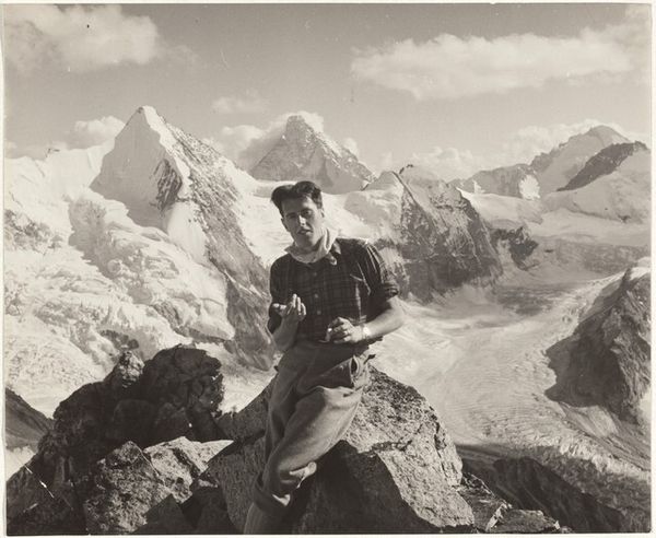 Curator: Standing before us is Robert Frank's "Mountain farmer, Canton of Valais," captured between 1943 and 1944. A gelatin silver print, it embodies both portraiture and landscape traditions. Editor: Stark. Immediately, I'm drawn to the contrast – the deep blacks against the blinding snow, the textured roughness of the man’s attire against the smooth mountain backdrop. Curator: Absolutely. Frank, even in these early works, presents a compelling duality. The figure anchors us, drawing us into the historical weight carried by the land. Mountains often symbolize endurance, challenge, perhaps even a spiritual striving, deeply rooted in the cultural memory of the Swiss. Editor: And how that is reflected in this man's attire and equipment! Looking at those wooden skis, and considering the wartime context, there's a real sense of labor here. The image really prompts me to think about the material circumstances: getting photographic equipment up the mountain, the type of heavy clothing that would have been worn for that sort of weather...it really invites thinking of those material details. Curator: His gaze too – direct, unflinching. He's not romanticized, but presented as part of this demanding environment, hinting to cultural identity forged through hard work and hardship. Do you think Frank consciously plays into the historical trope of the 'noble peasant?' Editor: Perhaps. Though the photo strikes me as straightforward in process and aim. It doesn’t feel overly staged. You see the work worn by him but it feels realistically portrayed rather than allegorical. Curator: Ultimately, Frank delivers a complex portrait of man and land, subtly questioning romantic ideals through stark realism. Editor: For me, it emphasizes how essential the often overlooked aspects of art making—labor, material conditions, technical skill—shape how a portrait embodies something seemingly straightforward and unadorned.