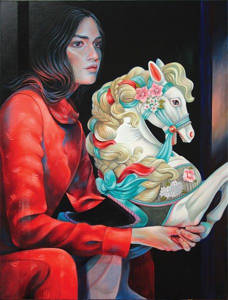 Curator: My initial impression is one of fragmented identity. It's striking how the portrait is both present and dissolving. Editor: Indeed. We're looking at "All The Way Down" by Martine Johanna, an acrylic painting from 2018. The piece features a woman holding an apple, rendered in a style that blends portraiture with neo-expressionist abstraction. Curator: That apple is instantly recognizable as an archetype. Is it temptation? Knowledge? Innocence lost? Its radiant, almost luminous quality set against the darker abstract forms pulls me in. Editor: Absolutely. It is hard not to view the object outside a political or historical framework. Apples appear frequently in modern art during periods of social change as a powerful symbol of renewal but sometimes destruction, a common theme after 2010. Curator: And what about the jagged shapes surrounding her? To me, they could represent psychological barriers, or even societal pressures bearing down on the individual. They seem to encroach upon her personal space, fracturing her sense of self. The use of layered images suggests the internal life versus the self as we project it. Editor: I agree, these abstractions could represent how modern capitalist institutions are reshaping ideas of identity in the post-digital age. These hard-edge elements hint at pop art influences too, with their flattened planes of color and sharp outlines. It certainly reflects a larger trend within contemporary art to integrate abstraction and familiar shapes. Curator: You have that right. The abstraction feels visceral and unsettling. It is reminiscent of the internal struggles in portraits by Frida Kahlo, who embraced painful, visible imagery to confront and ultimately find liberation. Editor: It will be interesting to see if future scholars read her images as historical records of identity politics and social class during our time. Perhaps one day it will reflect something to a new audience like Van Gogh. Curator: I appreciate Johanna’s bravery in showing a fractured identity within her contemporary vision of symbolic neo-expressionism. It leaves me contemplating the various aspects of our hidden interior. Editor: Precisely. Art provokes these questions for generations. I imagine that “All the Way Down” has many levels left to unearth in due time.