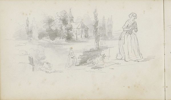 Curator: Looking at "Confidences in the Garden," a drawing by James Abbott McNeill Whistler from 1894. It's currently held at the Rijksmuseum. The piece uses pen and pencil. Editor: There's an undeniable air of intimacy. The quick, light strokes suggest a fleeting moment captured, almost secretly observed. It feels ephemeral. Curator: The marks definitely serve to capture a mood more than a perfect rendering. It reads as more of a preliminary work, almost a study for something more grandiose perhaps. Whistler seemed less interested in the end product and more interested in the initial act of making and mark making, judging by the quick and gestural handling of pen and pencil here. Editor: Gardens often carry loaded meanings—Eden, love, secrets. In this image, the enclosed space, the whispering figures, even the almost indecipherable facial features—all create an intriguing symbolic landscape. What are they confiding? The ambiguity heightens the intrigue. Curator: Agreed, the chosen medium, seemingly disposable in comparison to painting with oils, reflects a new industrial sensibility to mass production and disposable income. As newly affluent merchants collected art at a fever pitch, Whistler perhaps questioned the longevity of taste and luxury goods. Editor: That is a fascinating angle. It does raise questions about art's function in rapidly changing societal circumstances. I am curious about their fashion: long flowing gowns suggesting wealth and a kind of leisure. A leisurely stroll through the garden becomes a space to express wealth, and perhaps more illicit exchanges under a cover of luxury. Curator: This location probably provided both work and pleasure for the owner and maker, a far cry from previous iterations of nobility commissioning their likeness. The rising middle class is present here in the subject of Whistler's impression. Editor: This piece whispers so much, despite its lack of detail. We have these intimate yet almost hidden interactions suggested amid the burgeoning industry you speak of. A snapshot into an era, caught with a fleeting pen. Curator: Indeed. From a materialist perspective, this quick sketch serves as commentary on the new modes of artistic consumption. Editor: From my end, it provides access to symbolic and hidden interactions, and allows our thoughts to flourish with a deeper psychological intrigue.