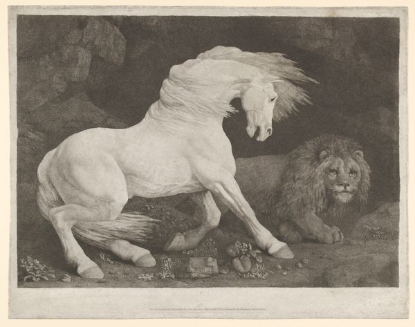 Editor: Here we have Raden Saleh's "Lion Attacking a Horse," painted in 1840 using oil paint. It's a really dynamic scene; the horse looks absolutely terrified. What strikes you most about this piece? Curator: The struggle depicted isn't just physical. Look at the horse’s desperate leap toward the chasm, the lion's firm grasp—it evokes primordial struggles reflected across cultures. It echoes images of predator versus prey, a dance as old as time itself, but rendered with the artist’s cultural memory. What symbolic load does this scene carry, do you think? Editor: I hadn't considered the cultural context! It feels very Romantic, that dramatic intensity. Is that linked to its deeper meaning? Curator: Romanticism prized strong emotions, and Saleh, though trained in Europe, brings a specific sensibility. Consider the horse – often a symbol of nobility, now victim to primal force. The lion, of course, symbolizes power. But power over what? Conquest? Domination? The Javanese audience would recognize a different implication to these images of power. Do you see these symbols differently now? Editor: Yes, the symbols are like layers of meaning. It's not just a lion and a horse, but power dynamics being played out. Curator: Exactly. The drama contains codes relevant to history, status, nature, and place, speaking in different languages according to the viewer’s background and emotional association. The power of iconography lies in its adaptability, creating meaning anew each time we view it. Editor: I'm definitely looking at this in a completely different light now, it's more than just a dramatic depiction of nature, it’s an intersection of cultural viewpoints and a complex discussion on power itself. Curator: Precisely, the power and drama in that intersection of views.