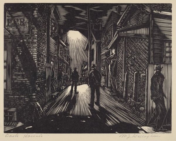 Curator: This piece is an untitled lithograph by Hans Gustav Burkhardt, created in 1948. It’s also rendered in ink, pushing the capabilities of printmaking. Editor: My first thought? Stark. Like a nightmare etching of a city struggling to breathe. The heavy lines really do capture this sense of urban anxiety. Curator: Absolutely. We see here the social consciousness that often ran through Burkhardt's work. The materiality itself is key, the contrast of the ink on paper allows for an understanding of light and shadow; its method reveals a stark critique through its use of raw materials and method. Editor: It feels emotionally raw. Like Burkhardt poured all his frustrations onto that stone. Look at those abstracted figures; they almost seem trapped. Curator: It’s thought to draw inspiration from surrealism. It's interesting to consider how Burkhardt challenged traditional printmaking. He blurs boundaries by highlighting process in the labor. Editor: Well, it succeeds, don’t you think? It gives me this creeping sensation. It looks and feels deeply uncomfortable. The piece captures, well, it feels dystopian even before that term was totally trending! There's a vulnerability, or is it defeat, almost etched in every stroke. Curator: It's not merely representation, it's active critique; by considering it an abstraction, one is ignoring that its value comes from the real world. The abstraction can easily be understood as something representative, a response to real life conditions and labor. Editor: So true! I mean, after seeing this, I kind of feel I need to decompress from what I would consider such urban pressure—almost like you are staring into the face of existential urban dread. Curator: Yes, its production in 1948 situates it within a world reconstructing itself, making sense of itself; and perhaps the success of its mood emerges because its maker clearly knew the social construction it had to be produced within. Editor: To me, this is the beauty of a truly haunting artwork, it lingers… sort of gets under your skin in a way I am sure most can relate to even today.