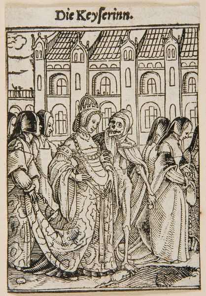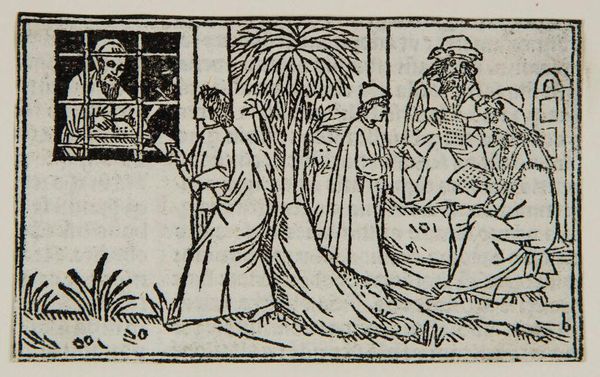 Editor: This is "Interior of a Yoshiwara Tea House" by Katsushika Hokusai. The patterning is so interesting! What can you tell me about it? Curator: Notice how Hokusai renders the Yoshiwara district as a site of labor. Each figure is meticulously crafted, suggesting an intense production process tied to the tea house's social role. Consider the woodblock printing process, and how that impacted consumption of art. Editor: So, the image itself is a product of labor? Curator: Precisely! And it depicts labor. How does that impact your understanding of the work? Editor: It makes me think about who had access to this image and what their relationship to the Yoshiwara district was. Curator: Exactly.