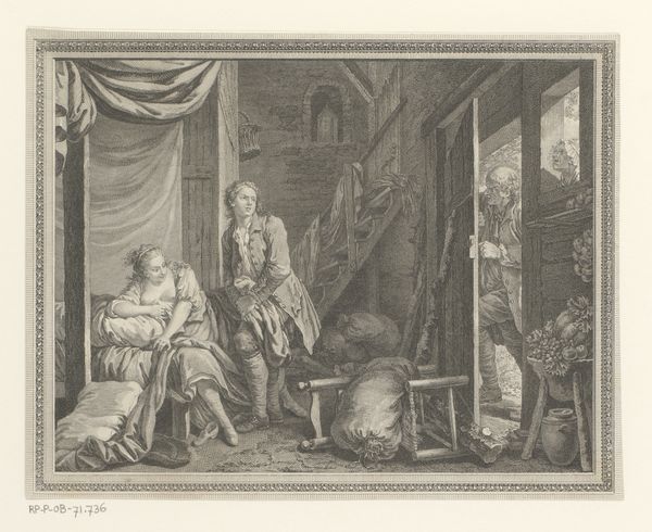 Curator: Ah, here we have Johann Georg Wille's "Musicerend gezelschap rondom een tafel," created between 1767 and 1769. What strikes you first about it? Editor: The light, definitely the light. It's an intimate scene, almost theatrical with the draped curtain, and everyone is clustered around the table—like a little stage. It gives me the sense of a closed-off world, intentionally shielded. Curator: A shielded world indeed, rendered with the exquisite detail characteristic of engraving. Notice the way the candlelight from the chandelier reflects on the faces; light often symbolizes enlightenment or divine presence, especially in scenes of this era. Editor: And within that sheltered space, we see a family performing music. It reads to me as a powerful assertion of privilege, of access to education, leisure, and art-making itself, at a time when so many lacked those opportunities. Curator: Precisely. Music and art have historically signified societal position. The figures themselves convey a symbolic language. Take the older man, for example. He's centered with his thoughtful posture and is likely meant to portray wisdom. Editor: But who had access to such wisdom? Looking closer, the figures, seemingly engrossed in their performance, almost become props themselves. Are we, the viewers, meant to aspire to such a seemingly ideal family? How do we critique these images today given the power structures embedded within the society in which the artwork was created? Curator: Interesting reflection. I agree that the image idealizes, while, simultaneously, revealing and concealing specific cultural dynamics. Wille masterfully conveys layers of narrative through the posture, facial expression, clothing, and other such objects around them. Editor: It reminds me that even seemingly candid depictions can serve to reinforce established hierarchies, and we have to interrogate these seemingly intimate moments for whose stories aren't told. Curator: A crucial observation. Ultimately, this piece provokes reflections about the boundaries between representation and reality in this period. Editor: Agreed. And, the more we dig into historical objects like these, the more complexities we uncover in both past and present society.