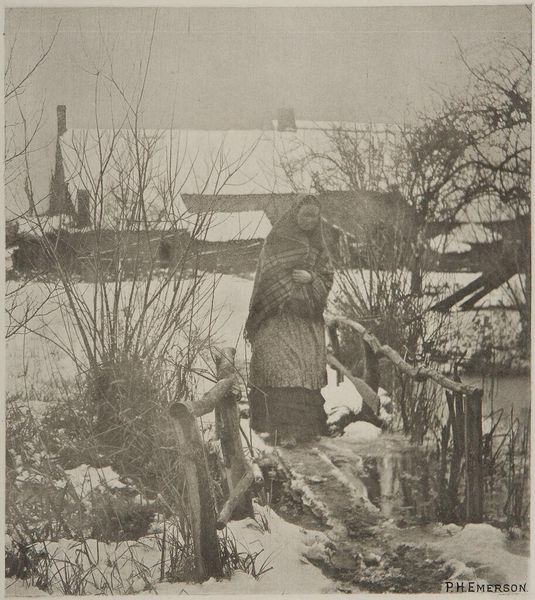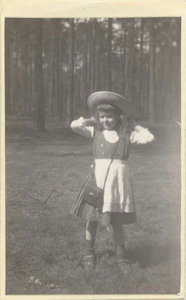 Editor: We’re looking at a gelatin silver print by Waldemar Titzenthaler from 1917, titled "Marba Titzenthaler, dochter van de fotograaf, glijdend over de sneeuw op het dakterras van het woonhuis in de Friedrichstrasse, Berlijn" or, "Marba Titzenthaler, daughter of the photographer, sliding over the snow on the roof terrace of the residential building in Friedrichstrasse, Berlin." It feels like a candid snapshot, despite probably being posed. What compositional elements stand out to you? Curator: Primarily, it's the interplay of light and shadow that commands attention. The stark contrast defines the forms—note the geometrical patterns in the girl's clothing which intersect with the implied lines of the snowy rooftop, and then are offset by the round, dark form to her left. The light catches the surface textures, enhancing the sense of depth within this seemingly simple composition. Editor: So you’re focusing on the lines, shapes, and tones... what about the subject of the photograph? Does the photographer's choice to capture his daughter in motion inform your interpretation? Curator: It is through form that we can apprehend affect. I propose that the photographer strategically aligns visual cues of temporality. Observe the slight blur in the figure’s outstretched arm against the backdrop of rigid geometric linearity, suggesting the ephemeral nature of childhood and the relentless march of time. These elements engage in a complex dialogue. Editor: That’s fascinating. So even within something so simple, a lot is happening in terms of shapes, shadows and how they create movement. It’s a different way to look at it. Curator: Indeed, and one might suggest that the very flatness of the photographic surface enhances these contrasts, offering a distilled experience of form itself. I am glad that you gained new insights to decoding an artwork.