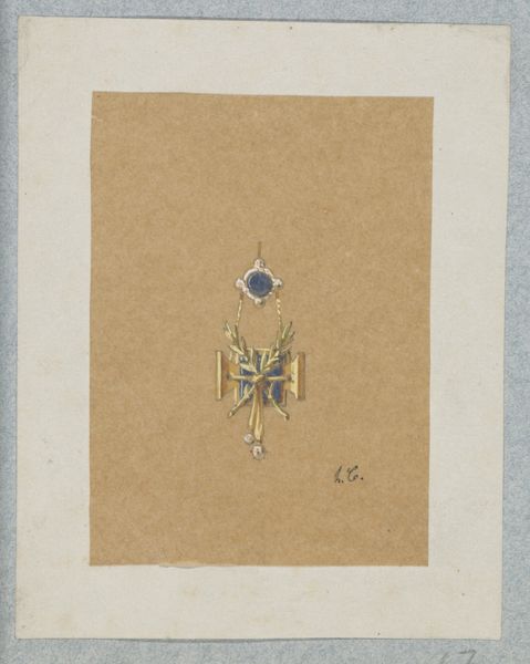 Curator: Immediately striking! There’s such a delicate, almost mournful quality in the faded pastels. Editor: Indeed. We’re looking at “Cap or Bonnet Pin,” a design on paper using watercolor and pencil, created in 1938 by John H. Tercuzzi. The pearls depicted offer the same sensation as you mention: a reserved aesthetic, but the gold brings light to them, the pearls shine due to this combination. Curator: Pearls, aren’t they always entangled with narratives of purity and also loss, in the cultural psyche? Given the date, just before the war, perhaps this pin embodies a yearning for a certain type of feminine presentation that felt threatened. Editor: I wonder if it speaks to class. Jewelry has, across many cultures and eras, signaled one's position in society, and a cap or bonnet pin adorned with what appear to be pearls suggests a desire for upward mobility during a period of economic anxiety for many. Moreover, accessories dictate gender codes as pearls themselves might reflect conservative values about women's roles. Curator: I see pearls, too, as embodiments of accumulated emotion and experience. The shape recalls tears—precious tears, captured and immortalized. The arrangement on this design, so meticulously drawn, speaks to a hope for transforming sorrow into something beautiful. Editor: The stylized floral component and golden rods offer that transformation you mention—a kind of hopeful modernism. I appreciate how Tercuzzi situated a traditional symbol like the pearl within a slightly more streamlined, almost Art Deco-inflected design. Curator: Yes! There's a negotiation happening between past and future, sorrow and…perhaps not joy, but certainly elegance. It invites us to reflect on what aspects of femininity or beauty traditions we choose to carry forward. Editor: Right, what aspects and for whom? This piece, as a design, presents potential, and a space where identity is not yet concretized, and opens considerations regarding to whom access to such potential is granted. Thanks for your time. Curator: Thank you, and my pleasure. What a compelling encapsulation of beauty, history, and identity we’ve just touched on.