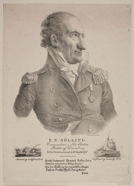 Curator: Here we have a lithograph print from the 19th century, “Seen Andersen Bille,” made sometime between 1834 and 1866, now housed at the SMK, Statens Museum for Kunst. Editor: The man is formidable. It's a portrait of authority and, dare I say, a touch of melancholy? You can practically feel the weight of duty etched into his face. Curator: Absolutely. Lithography allowed for a wider dissemination of images, like this portrait. Think about the workshops, the specific stones they would have used, and the skilled labor required to produce these prints on a mass scale. The infrastructure was pretty involved. Editor: And think of what he represents, beyond just an individual. The naval officer’s portrait carries the weight of Danish maritime power, especially during a period of shifting geopolitical currents. This image probably shaped public perceptions of military leaders and Denmark's role in global conflicts. What's conveyed by those ships fading into the background, almost as though receding from the future, or receding from this particular moment in history? Curator: Exactly. And looking at the materials, lithographic stones were prized for their fine grain, offering a relatively efficient means to replicate images for different markets, connecting artistic production with consumerism. Editor: It prompts us to ask: who was this man beyond his rank? What socio-economic background shaped his worldview? Were there intersectional dimensions, of gender and race that impacted his path? I'm curious about the untold stories surrounding him. Curator: We need to consider not only his role, but also the printmakers role, how this process impacted their class, production, and even the economic drivers behind its distribution. How was this labor compensated? These factors are essential to a comprehensive reading. Editor: His medals signify status, power. In a different sociopolitical reality, they could easily read as instruments of oppression, given histories of imperialism. Who benefited and who suffered from his accomplishments? Curator: Seeing his world framed through material output encourages one to re-evaluate social value itself. Editor: Indeed. His gaze, the receding ships... there's more than meets the eye regarding how we, even now, interpret those historical intersections.