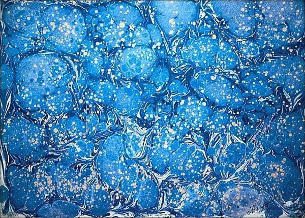 Editor: Here we have "Gelgit," a mixed-media work by Mustafa Duzgunman. It gives the impression of swirling currents and immediately makes me think of water, of something flowing. What's your take on this abstract piece? Curator: "Gelgit," aptly named "Tide," brings to mind the traditional craft of Ebru, Turkish paper marbling. It’s critical to acknowledge its production: pigments carefully floated on water, manipulated, then transferred to paper. The material process informs the entire aesthetic. The bubbles trapped in the pattern point to the inherent qualities of the medium used. Can we consider this 'high art' or is it simply a decorative craft item, elevated due to the gallery context? What are your thoughts? Editor: That's fascinating. I hadn't considered the connection to marbling specifically. The choice of mixed-media definitely elevates it, questioning the typical uses of those materials. Thinking about the labor involved—the patience and skill—makes me see the artistic intention beyond pure decoration. Curator: Precisely. It challenges the separation between art and craft. The swirls, almost mechanically reproduced, also question ideas of uniqueness in art production. Look at how the pattern repeats— is it mass produced, or a simulation of mass production through the labor-intensive process? Editor: I see what you mean. The material context really reframes the way we interpret the whole thing. Thanks for pointing out those material qualities, it’s really changed how I look at the artwork. Curator: It is important to move beyond the surface. By examining the labor and process, we can reveal so much more about an artwork’s value and cultural significance.