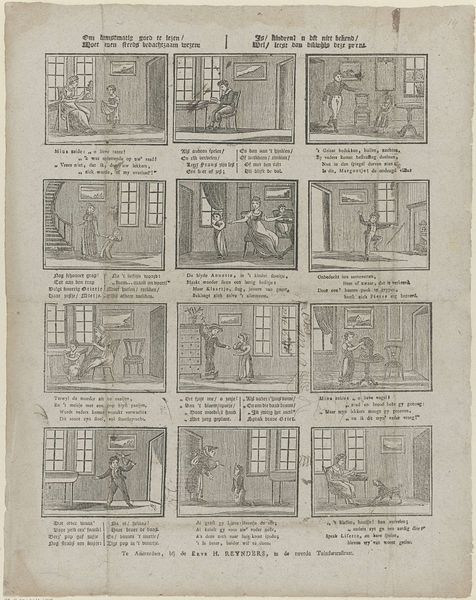 This print, "Kinders ziet hier de Vryagie eens aan van Krelis en Maartje van Oostzaan" was created by weduwe H.J. de Roode & Zn. These scenes offer a glimpse into the social rituals and expectations surrounding courtship and marriage during the Dutch Golden Age. The sequential panels illustrate the formal steps of betrothal, each marked by specific gestures and exchanges. We see not just a narrative of love, but one deeply entwined with social status and economic considerations. What emerges is a choreography of propriety, a world where personal desires are often secondary to familial and societal norms. The emotions, desires, and vulnerabilities of individuals are carefully managed within a public display. Reflect on the cultural values that shaped these interactions. What does this print tell us about the negotiation of power, affection, and alliance within the bonds of marriage?