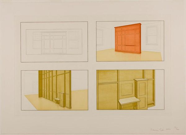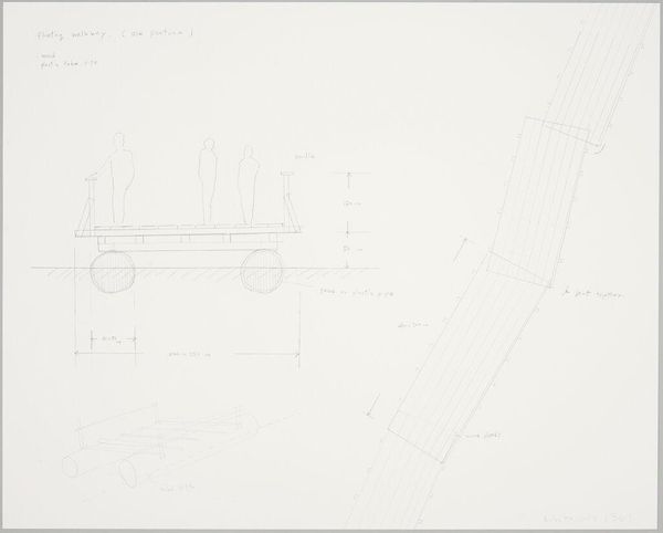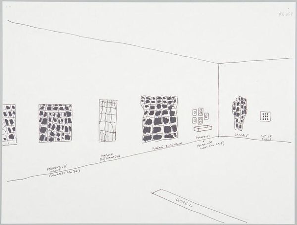 Editor: So, this is Mel Bochner’s "Studies for Sackler Gallery Installation." I find this sketch strangely calming, like a blueprint for a zen art space, perhaps? What do you make of its simplicity? Curator: It’s like peeking into Bochner’s mind, isn't it? A very interior space! The sketch seems to be about the act of arranging, of playing with ideas before they solidify. Do you see how he's labelled elements – "crumple," "transparent/opaque?" Editor: Yes, and "out of focus." It's like he's annotating his own thoughts. Is the simplicity of the lines an invitation to us, to finish his thoughts? Curator: Perhaps. Or maybe it's Bochner inviting us to consider the very nature of perception. The work becomes a playful conversation, a whisper of possibilities. I appreciate the raw spontaneity of it. What do you think? Editor: I agree. It’s like he’s saying, "Here are the ingredients, now you dream the installation." It's strangely liberating to see the art before the art.