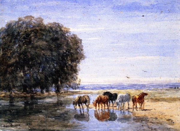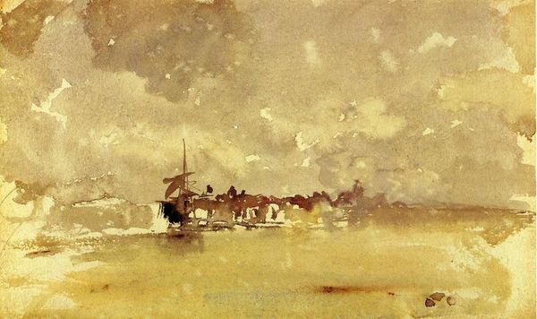 Editor: Here we have Frederick Carl Frieseke’s “Horse in a Field Watercolor” from 1899. It’s... interesting. The colors are muted, almost blending into each other. What do you see in this piece, something beyond the obvious Impressionistic style? Curator: This watercolor presents us with more than just a pastoral scene. I see a subtle commentary on labor and rural life at the turn of the century. Notice how the horse is the central figure, yet seemingly unburdened, standing passively. What do you make of that passivity in relation to its historical context? Editor: Hmm… You mean like the social position of rural communities at that time? Was Frieseke maybe commenting on the relative power, or lack thereof, of farmers? Curator: Precisely! Think about the industrial revolution and its impact on agriculture. The Impressionists, in their focus on everyday life, often captured these societal shifts. Also, note the lone figure in the background—seemingly working. How does that figure contrast with the horse? Editor: So, while on the surface it looks like a peaceful landscape, Frieseke subtly hints at the socio-economic realities impacting these individuals and their livelihoods. Is that what you're suggesting? Curator: Yes. The hazy, indistinct figures aren’t just Impressionistic technique; it speaks, perhaps, to a marginalized existence. And considering Frieseke's background as an American artist working in France, his gaze may be colored by his outsider status. Editor: That's fascinating. I had only seen it as a simple depiction of farm life, but now it’s clear that there are a lot of important points of discussion there. Curator: Exactly, and by examining those elements together, we start to piece together the historical and social narrative woven within.