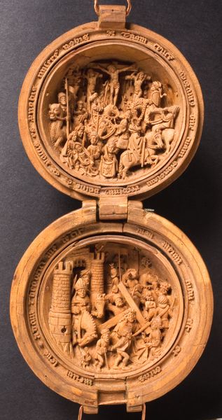 Editor: We're looking at "Miniature Altar. Triptych with the Passion of Christ" created between 1498 and 1501 by Adam Dirksz. It's a wooden carving, currently at the SMK in Copenhagen. It's small, but incredibly detailed! It's hard to fathom all that narrative compacted into such a tiny space. What do you make of it? Curator: It feels to me like stepping back into a world of faith made tangible, doesn’t it? These intricate carvings weren’t just decorations; they were devotional objects. Imagine someone holding this little world, meditating on the Passion, really feeling it… It’s like holding a condensed epic, isn't it? The story is deeply personal, you are supposed to keep this piece close. The precision involved in making each of those tiny figures... have you ever tried whittling? Editor: Once, and I gave up after stabbing myself three times! The detail is astounding. The way he captured movement and emotion in that compressed space… Were these triptychs common at the time? Curator: Massively popular, especially with wealthy individuals. They'd take these with them on travels – a portable church, of sorts! Did you notice the contrast between the busyness of the Crucifixion scene and the stillness of the Lamentation at the bottom? Dirksz uses composition to highlight the emotional weight of the different moments. He does really make the artwork an invitation for self reflection. Editor: Yeah, the bottom feels more somber and still. What strikes me now is just how much storytelling can be packed into such a miniature world! Thank you! Curator: A journey through faith in the palm of your hand. Amazing how artists could compress such huge topics in to something you can literally, personally connect with!