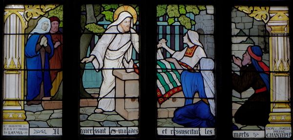 Curator: This stained-glass piece, entitled "Life of Christ: L'enfant Jésus et Les Docteurs," was created in 1919 by Ludovic Alleaume for the Église Saint-Sulpice de Fougères. My first impression is the striking combination of intense colors against the dark lead lines—it feels both antique and incredibly vivid. Editor: It does evoke a powerful narrative feel with the bold leading reinforcing the separation of characters. Let’s think about this from the ground up—what glass was used here and how did the process of production inform the end product? Were these colors readily available at the time, impacting Alleaume’s choices? Curator: That's an interesting point, but from a more historical perspective, how might the church’s socio-economic position and that of its parishioners shaped Alleaume’s work and that of its patron’s as reflected in the inscription details? The prominent display in a church also tells us about its intended public function. Editor: Yes, considering the church's commission offers us a peek at the labor and funding required. Was the choice of stained glass seen as a common artistic method at that time, or would have it be a significant decision reflecting available skill within a specific community? And what kind of statement are both patron and church making? Curator: Right. Looking at the symbolism and the broader historical context is also key. This scene, depicting the young Jesus astounding the elders with his wisdom, resonates with a specific theology, and likely also spoke to the contemporary social and political anxieties. How effective, historically speaking, do you feel it conveys this to the viewer? Editor: It's also very interesting to explore how each of these individuals would be tasked with creating stained glass work that reflects historical events! This type of stained-glass has more use of paint work versus colored glass; were glass paint readily available or costly at the time? Was the division of work based on those skills? Curator: Absolutely, you know, thinking of those practical considerations makes this much richer to interpret; considering all those various components and the politics around these visual representations enhances my overall understanding and it is something the contemporary visitor might appreciate and reflect about Editor: Likewise, focusing on production and the division of labor within workshops reframes our appreciation of this kind of religious visual.