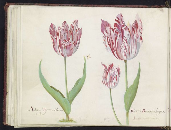 Editor: This watercolor, titled "Two Tulips with Butterfly," was painted by Jacob Marrel around 1637. It’s striking how the red streaks pop against the white petals. What is your perspective on this piece? Curator: The structure is rather compelling, isn’t it? Note how Marrel utilizes the white space to frame the tulips. This choice emphasizes the intricate details of their forms and allows the eye to focus on the variations in color and texture. The butterfly provides a small focal counterpoint and emphasizes through contrast the formal properties of the flowers. Editor: So you're saying that the empty background and even the inclusion of that single butterfly are all about directing our attention to the tulips themselves? Curator: Precisely. It minimizes distractions, allowing the tulips’ linear elegance to take center stage. Notice also the nuanced gradients within the red streaks. How do these color gradations play a part? Editor: I see that they almost create an internal structure, giving each petal depth and making them look three-dimensional. They define the form without needing strong outlines. Curator: Yes. Marrel’s careful manipulation of light and shadow transforms flat paper into what feels like tangible form. Do you also observe how the symmetry inherent to tulips as a species, gives the image balance? Editor: That’s true, the butterfly complicates that somewhat, which is intriguing! I hadn’t really thought about botanical art in terms of its formal properties before, but you’ve given me a lot to consider. Curator: Likewise. It’s always fruitful to reconsider familiar objects and analyze the arrangement of forms and compositional structures of visual media.