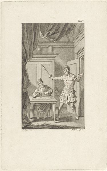 Editor: This is "Modes et Manières du Jour, 1800-1801, latere druk van No: 4: Chaise vacant (...)" by Louis Philibert Debucourt. It’s an engraving, a print of a fashionable woman. I find it interesting how relaxed and nonchalant she looks, seated so casually, yet also elegant, but then there's a random gentleman standing way off in the back, almost like he doesn't belong. What do you make of this scene? Curator: That "Chaise Vacante," or "Vacant Chair" is suggestive, isn't it? A chair left empty always whispers a story. Here, within the evolving fashion of the Directoire period, it might hint at absence, waiting, or even a power dynamic. She’s positioned quite high, seemingly at the height of her fashionability, so could her posture symbolize independence, or even indifference? Editor: Interesting. So the vacant chair might not just be a random detail but loaded with meaning about social relationships? Curator: Precisely. Note the gaze; is it inviting, dismissive, melancholic? How does her bonnet and shawl, as indicated in the title, further inform the intended mood, and more broadly, do they provide commentary on class, gender, and even the lingering echoes of revolution? Even the incidental gentleman contributes, through costume, pose, gesture and position in relation to the foreground figure, to our experience and potential interpretations. What thoughts do they trigger for you? Editor: The fact that she's facing forward looking directly out while he’s got his back half-turned and is looking in on her… It makes her a confident main focus, while he looks less involved, but maybe observing. Curator: The intentionality of dress combined with elements within domestic or societal space speak to the spirit of the age; memory, power and expectation collide within the most 'minor' objects such as dress and furniture! What do you think that overall effect speaks to in terms of cultural values at that moment in time? Editor: This helps to look at the painting not just for what it is, but for what it represents culturally! I wouldn't have considered the symbolic weight of something like a vacant chair so carefully.