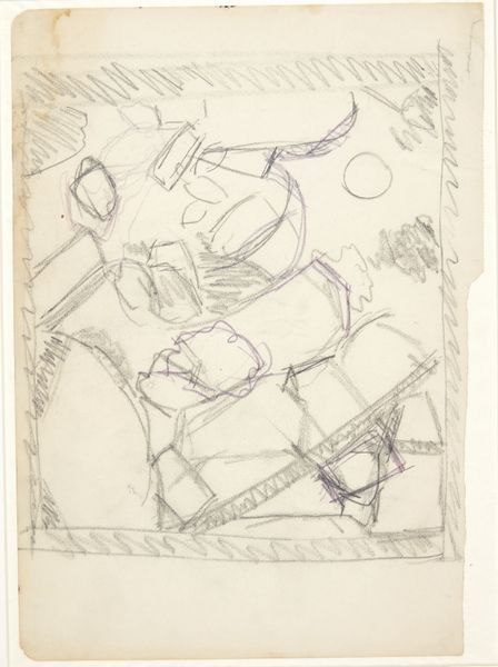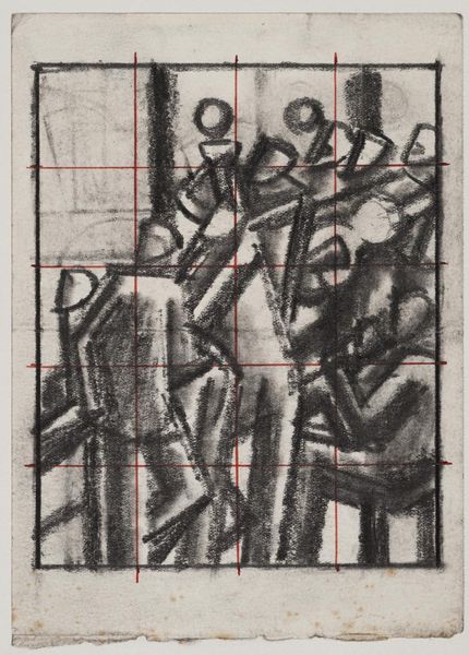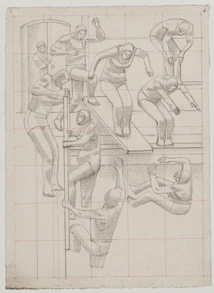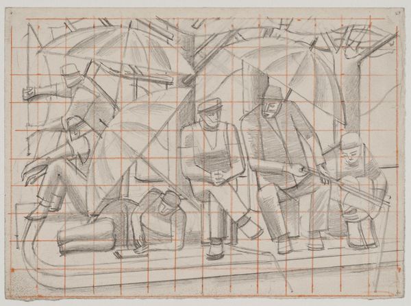 Editor: This is William Roberts' pencil drawing, "Group of people in a field". The figures, overlaid with a grid, seem to be caught in a moment of collective action. The mood feels both industrious and a bit… fragmented. What do you make of it? Curator: Fragmented is a good word. For me, the overlaid grid speaks volumes. It’s like Roberts is trying to impose order, maybe even a sense of mechanical precision, on this very human scene of labor. There’s a tension, a visual push and pull between the organic forms of the workers and the rigid structure of the grid. It's as if he were asking if humanity can truly be measured, regimented. What do you think? Editor: So, almost like a study of man vs. machine? Curator: Exactly. It is a beautiful visual question. Editor: Definitely gave me something to chew on.