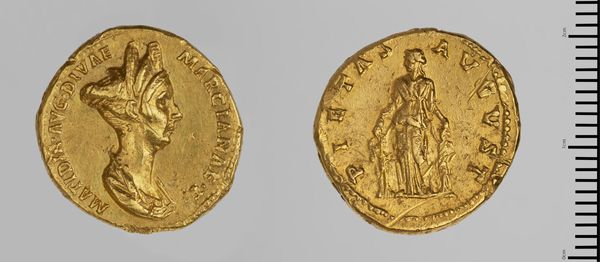 Curator: The Harvard Art Museums hold this stunning gold coin, an aureus of L. Aelius Caesar. Editor: It's immediately striking how much symbolic weight is packed into such a small, glimmering object. Curator: Indeed. Coins served as powerful propaganda tools in ancient Rome. This one features Aelius Caesar, Hadrian's intended successor, and would have circulated widely. Editor: The image of Concordia, seated and holding a patera, speaks volumes about the desired harmony and stability of the state. It's a carefully constructed visual message. Curator: Absolutely. The depiction of Concordia was intended to associate Aelius with peace and unity, crucial for legitimizing his claim to power. Editor: The gold itself is important, isn't it? It suggests power and authority. The coin feels like a condensed symbol of the entire Roman system. Curator: Precisely. It’s a small object carrying the weight of imperial ambition and the projected values of a society. Editor: Thinking about the coin's imagery has made me more aware of how valuable the object is. Curator: Yes, its value extends far beyond its weight in gold; it is an artifact that tells us about the social and political climate of ancient Rome.