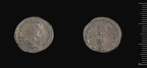 Curator: Here we have a Denarius of Caracalla, residing here at the Harvard Art Museums. Struck during his reign, this small silver coin provides a fascinating window into Roman imperial power and propaganda. Editor: It feels like a whispered secret from the past, doesn’t it? The worn surface makes me think of countless hands it must have passed through. Curator: Absolutely. The portrait of Caracalla, rendered in profile, projects an image of strength and authority, typical of how rulers cultivated their image. The other side depicts a Roman deity, reinforcing the link between imperial rule and divine legitimacy. Editor: Looking at this, I can't help but consider how this piece embodies the intersection of power, identity, and economics within the Roman Empire. What does it mean to have your face on money? It's kind of wild, really. Curator: Indeed, the Denarius of Caracalla serves as a powerful symbol of how identity and governance were carefully crafted and disseminated throughout the Roman world. Editor: It gives us so much to think about, even today.