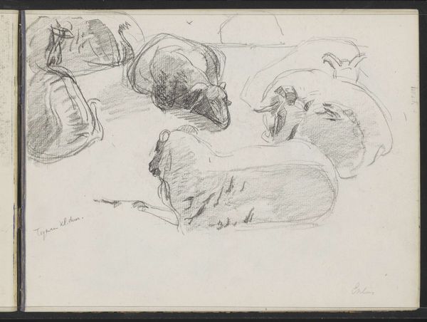 Curator: This is a sketch by Ferdinand Oldewelt, titled "Studieblad met schapen te Exloo," created sometime between 1904 and 1912, using pencil and ink on paper. Editor: It strikes me as incredibly peaceful. The soft lines and muted tones give a real sense of calm. There's also something very immediate and intimate about it, like we're looking at the artist's private thoughts. Curator: Absolutely. Oldewelt's sketches provide crucial insight into his larger artistic project. They're where he works through themes of rural life, reflecting a connection to the land and its people, particularly within the socio-political context of early 20th-century Netherlands and its evolving national identity. Editor: The sheep, as recurring symbols in art, are usually stand-ins for gentleness and piety, or even followers. Do you think there's anything else to read into them in the context of this artwork? Curator: That is a critical point to consider. Oldewelt lived during a period of social and agricultural reform. We could analyze his rendering of these sheep—specifically their vulnerability in these rough pencil lines—as representing a kind of precarious existence, vulnerable to larger systemic changes, reflecting on marginalized agricultural communities. Editor: I can certainly see that tension there. The sketch also reveals a raw honesty, stripping away romantic notions of rural existence. There's almost a melancholic recognition of vulnerability. It avoids glorifying and gives the viewer a glimpse into the mundane, challenging our notions of progress and societal development. Curator: And perhaps also subtly critiquing industrialization and its displacement of traditional ways of life. His careful observations of these animals invites us to consider how economic forces were reshaping rural communities. Editor: This image encourages introspection, moving past sentimentalized images of landscape. In a world where images constantly vie for our attention, its modest beauty, even incompleteness, offers us some breathing space. Curator: Agreed. It speaks to the enduring power of art to make us reflect on who we are, and where we are going as a society.