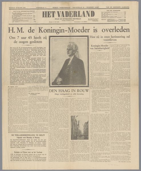 Editor: This is a print entitled "Het Vrije Volk van 24 mei 1945," possibly from that same year, by De Arbeiderspers. It appears to be a newspaper page, perhaps a poster or textile print given its tagging. It has such an immediacy, like holding a piece of history in your hands. What strikes you most about this piece? Curator: You know, when I look at this, I don’t just see newsprint; I feel the sigh of relief that must have swept through the Netherlands. Imagine, after years of occupation, seeing a headline like "Regering is in Den Haag” – the government is back in The Hague! Editor: It really emphasizes that direct connection with the news, and everyday people. Curator: Absolutely! It is not some dry history lesson but rather still warm with the urgency of liberation. See how the design is straightforward, almost functional? This was a message to the people, not some art world elite. Did you notice the somewhat haphazard layout? Each headline almost battling for attention; the piece vibrates. It’s life reclaiming its space. What is most interesting is what that feeling translates to. Editor: That is a good question; now it feels almost overwhelming with emotion! I find I’m drawn into the details. Curator: I felt the same overwhelming urge that so many share through a piece so honest. Every crease tells a story. Editor: Thank you, the information that you shared really shed light on what to look for. Curator: I loved getting to view art with you, every mind provides a new journey for my view.