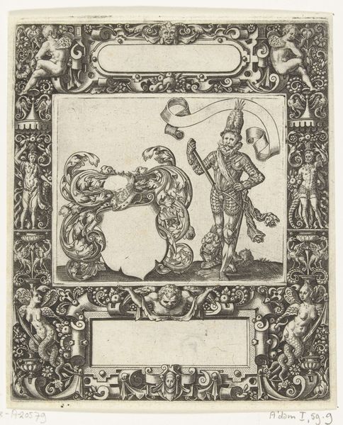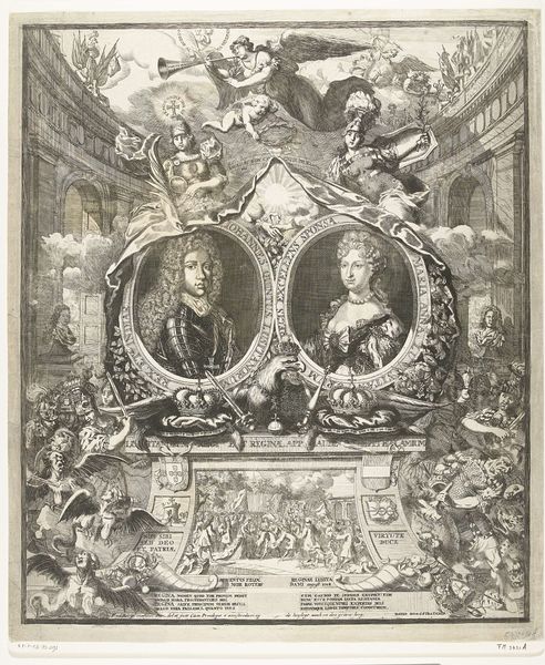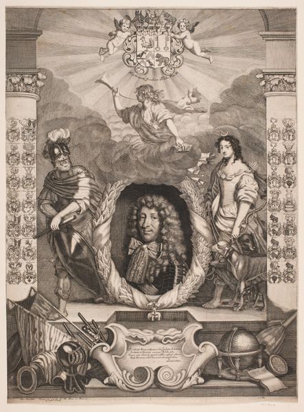 Curator: This engraving, made between 1670 and 1671, presents a portrait of Axel Juul by Ludovicus Salm. The piece is held at the SMK, the National Gallery of Denmark. What are your initial thoughts? Editor: My goodness, it feels like tumbling down a rabbit hole of symbolism! So ornate. It's almost dizzying. But intriguing, definitely intriguing. Curator: Ornate indeed. Let’s consider the framework. We observe two imposing columns, each adorned with a vertical arrangement of crests. What semiotic value might you assign to this element? Editor: Walls, perhaps? No, that's too simple. The columns look incomplete, topped with scrolls that seem ready to unfurl even more crests, as if ancestry were about to overtake the whole scene. Curator: An insightful perspective. Observe the interplay between light and shadow, skillfully achieved through hatching and cross-hatching. Notice how the artist employed this technique to define form and texture. Editor: You know, that rigid, classical technique feels strange with this dreamlike allegory unfolding around Juul. I mean, look at all the little cherubs swirling above, practically dancing on clouds that have text scrolls plastered across them! It's over the top but fascinatingly so. Curator: Yes, the Baroque period certainly embraced dynamism and theatricality. And here, within the wreath, we find the sober portrait of Axel Juul. Note the precise detailing of his facial features. Editor: It makes you wonder about the sitter, Axel Juul, and his place within all this visual spectacle. Is it glorification? Contemplation? What were they trying to communicate about him through such layered iconography? Curator: A valuable inquiry. This composition reflects an understanding of the academic approach, blended with line work, creating an allegorical representation rooted in both history and artistry. Editor: Right. You can stand here forever untangling it, imagining Axel Juul stepping out of that rather serious portrait into a world gone wild with familial pride and celestial commentary! Curator: It's certainly a piece that encourages deeper contemplation on the power of visual language. Editor: Absolutely. It reminds us that images are rarely ever just simple depictions. Thanks!