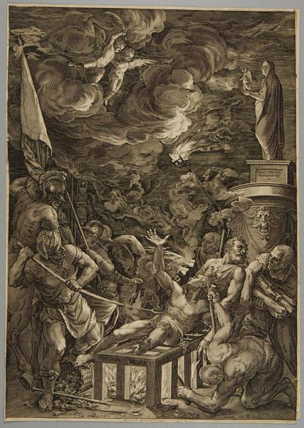 Curator: I find the dramatic chiaroscuro immediately captivating. It's an older work titled "Design for the Fugger Chapel in Augsburg: Samson Fighting the Philistines" and is credited to Albrecht Dürer. Editor: It hits you like a punch in the gut, doesn’t it? All that chaotic energy bursting from a monochrome sketch. Like a heavy metal album cover from the 1500s. Curator: The composition is particularly striking. Dürer uses a dense, almost claustrophobic arrangement of figures to heighten the sense of struggle. Notice the dynamism achieved through the diagonal lines, leading the eye from the lower left to the upper right. Editor: Totally. Samson, right in the middle, feels like the eye of the storm. Everybody’s tumbling around him. And is that inscription supposed to be funny? It is sort of jarring against the hyper-violence on display. Curator: It's crucial to observe Dürer's mastery of line. The intricate detail, especially in rendering the textures of skin, fabric, and weaponry, demonstrates a meticulous observation of the material world, elevated through the symbolic biblical narrative. Editor: The way he throws that spotlight—if you can call it that—onto Samson makes the whole scene pop. All those little details in the armour, the crumpled bodies... It makes you think about power and its consequences. Very heavy stuff, even today. Curator: It evokes complex responses in viewers even now, wouldn’t you say? The formal precision amplifies the emotional turbulence inherent in the subject. Dürer presents us not only with the heroics of Samson, but also a meditation on the complexities of human strength. Editor: Definitely a piece that sticks with you. Not just a picture; more like an experience. It's that clash of beauty and brutality...pretty haunting. Curator: Indeed, it's a complex piece. And from an art historical standpoint, observing this work’s form and texture lets us better appreciate its role in marking a transition from late medieval to Renaissance ideals, but, of course, as the piece has proved, one's lived and embodied encounter matters. Editor: Yep, something in it just wrangles with the guts.