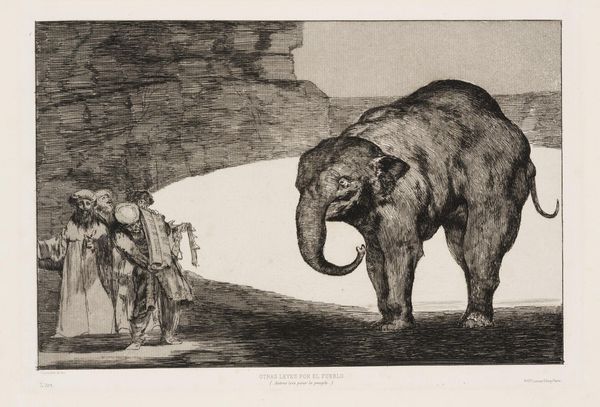 This etching by Francisco Goya, titled ‘Other laws by the people or beast Absurdity’, is one of a series of prints made in Spain likely between 1815 and 1824. The image throws into sharp relief the artist’s critical stance toward the established order of his time. Goya uses an unusual juxtaposition of figures: on one side, a towering elephant; on the other, a cluster of robed figures bearing what appears to be a scroll of laws. The elephant, often seen as a symbol of wisdom and memory, is here presented as a figure of imposing power. In contrast, the group of men seems to represent the old guard, clinging to outdated rules and traditions. The stark contrast in scale and demeanor suggests a critique of the institutions of law and governance. Historical research into the social and political climate of post-Napoleonic Spain can help us interpret these images more fully. Through prints like this, Goya challenges the viewer to question the foundations of authority and the nature of justice.