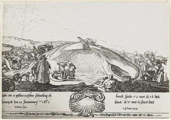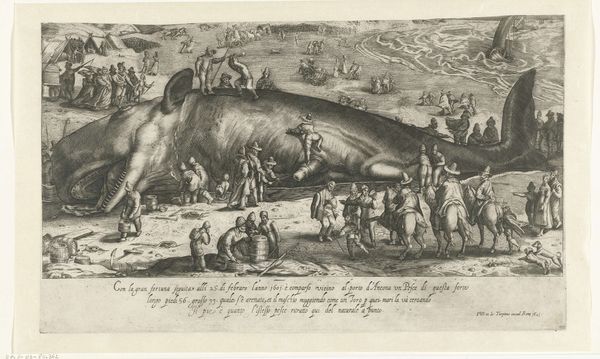 Esaias van de Velde created this etching, "Stranded Whale on the Beach at Noordwijk," in 1614. It captures a moment of public fascination and interaction with nature, reflecting the cultural and scientific curiosity of the Dutch Golden Age. The scene depicts a stranded whale surrounded by a diverse crowd. Their reactions range from curiosity to practical interest. This gathering is a social tableau, revealing the era's complex relationship with the natural world. It also hints at the economic opportunities such an event could represent, where a whale carcass could be a source of blubber, bones, and other valuable materials. The etching invites us to consider our contemporary relationship with nature. Are we passive observers, exploiters, or stewards? What does it mean to witness such a spectacle today, in an age of heightened ecological awareness? Van de Velde's image becomes a mirror, reflecting our own attitudes and values regarding the environment.