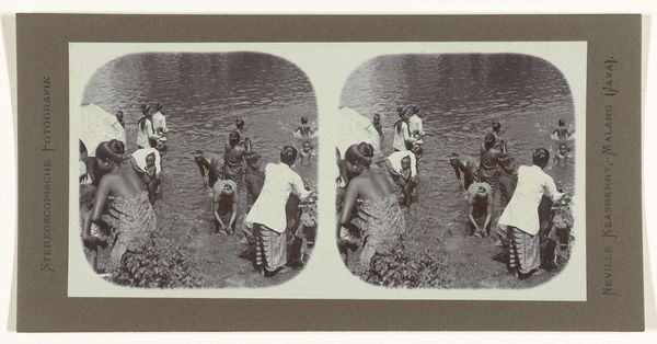 Curator: Immediately striking, isn't it? A communal experience distilled into this vintage stereoscopic albumen print. Editor: There's a serenity to it, a quietness. Despite the number of people crowded on that raft, it feels incredibly still, almost timeless. But also the weight is real; something potent lies under this group portrait. Curator: The piece, created by Neville Keasberry sometime between 1900 and 1935, is entitled "Mensen op een vlot in het meer van Wendit op Java"—"People on a raft in Lake Wendit, Java". The image speaks volumes about colonial era dynamics. Stereoscopic photography gained popularity as it served an instrument to "capture" and document far away people and landscapes in Java as well as serve as a token of remembrance for travelers. Editor: The raft itself becomes symbolic—a temporary island of shared purpose. I see the image speaking to human interaction and mutual dependency within a cultural narrative. Do you think the mountains behind add to the iconography here? They almost watch over this intimate scene. Curator: Absolutely. Mountains often held sacred significance. The mountains as spectators add a level of meaning within the historical context in which this photograph was captured. Photography in this area provided "objective" images for audiences far away, as it presented exotic landscapes and cultural experiences from foreign locations. Editor: Also notice the depth added by the choice of water. Calm in parts and broken elsewhere, this juxtaposition underscores the themes of stability amidst uncertainty. What is fascinating is how this tension transforms it to a lasting symbolic power that resonates far beyond its time. Curator: A colonial snapshot transcends mere documentation. We are confronted by lingering questions on how people construct the memory of cultural encounter via photograph. It certainly offers much food for thought. Editor: A captivating image and a telling dialogue; I think this photograph really deserves its moment.